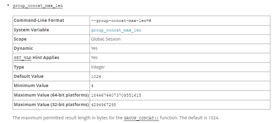 group_concat_max_len系统变量指定的最大长度,该变量的默认值为 1024