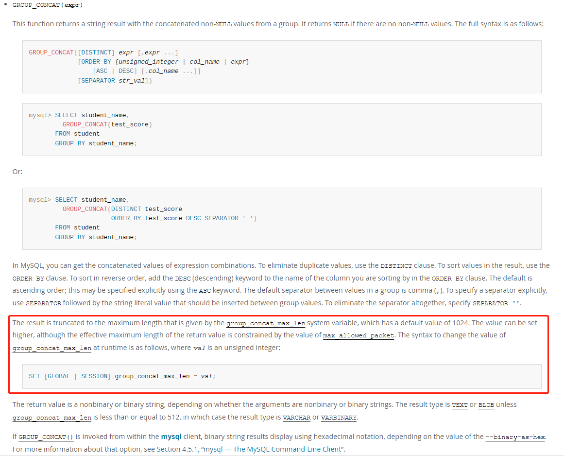 MySQL官方文档关于GROUP_CONCAT()函数的说明: